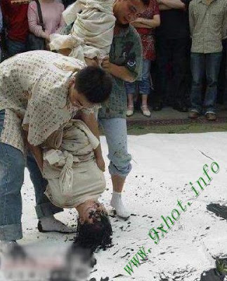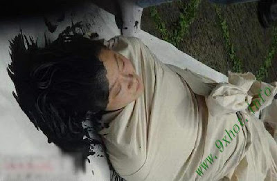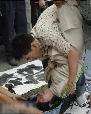 Chuyện dùng các bộ phận cơ thể từ râu, cằm cho đến chân để vẽ tranh hoặc viết thư pháp có lẽ không còn lạ lùng gì với chúng ta, nhưng việc dùng cả một… con người để viết thì chắc chắn sẽ bị coi là điên rồ . Thế nhưng mới đây 2 sinh viên người Trung Quốc đã làm chuyện điên rồ này trước mặt rất nhiều người, trong đó có cả các nhà báo. Một cô gái có mái tóc đen dài được bọc vải toàn thân (nhìn qua tưởng là xác chết ) đã trở thành "cây bút" cho hai anh sinh viên này viết một bức thư pháp lớn bằng mực tàu. Suốt quá trình vẽ tranh, cô gái bị dốc ngược đầu, mái tóc nhúng vào chậu mực tàu và chân tay vẫn trong tình trạng bó chặt dưới lớp vải thô . Chẳng biết khi tình nguyện làm việc này, cô ấy có biết nó sẽ vất vả và khó chịu như thế không.